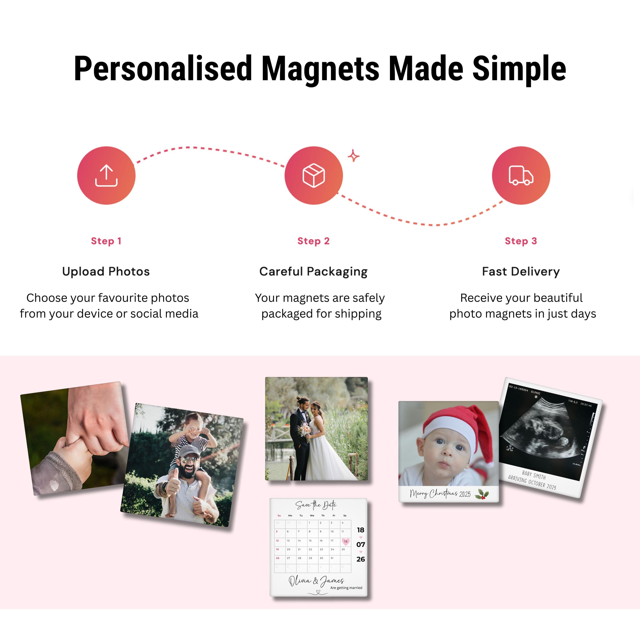 Our personalised magnets turn your favourite moments into unique keepsakes. Whether you order a single magnet or a full set, each one is made with care and high-quality materials so your memories stay vibrant for years. Perfect for fridges, gifts, and special events — and always delivered with love.